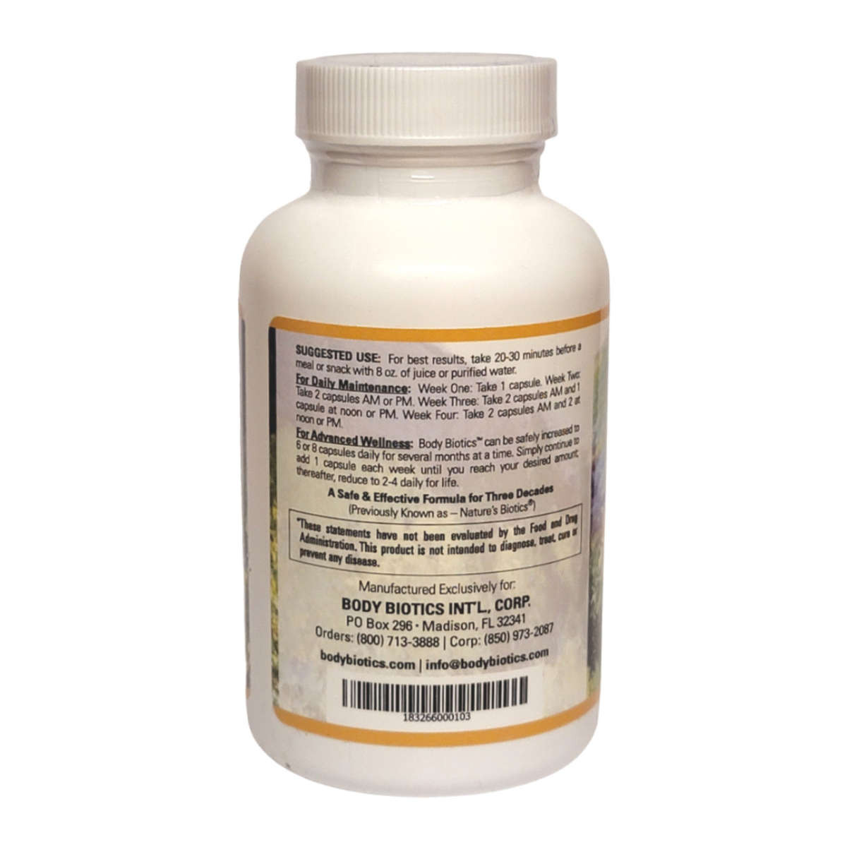 Maintenance Dosage: When starting your daily regime of Body Biotics™, it is recommended to take 1 capsule a day the first week, 20 to 30 minutes before a meal. Week two: increase dosage to 2 capsules a day and continue to up the dosage by one capsule every week until you reach your desired goals. Most people will level off at 4-6 capsules per day for several months and then back to a daily regime of 2-4 capsules per day, based on diet and health. CHILDREN 2 and older, take ½ of adult dosage up to 2-4 capsules per day.