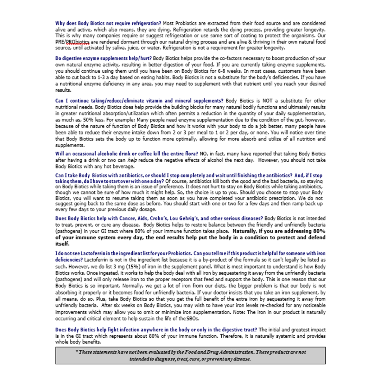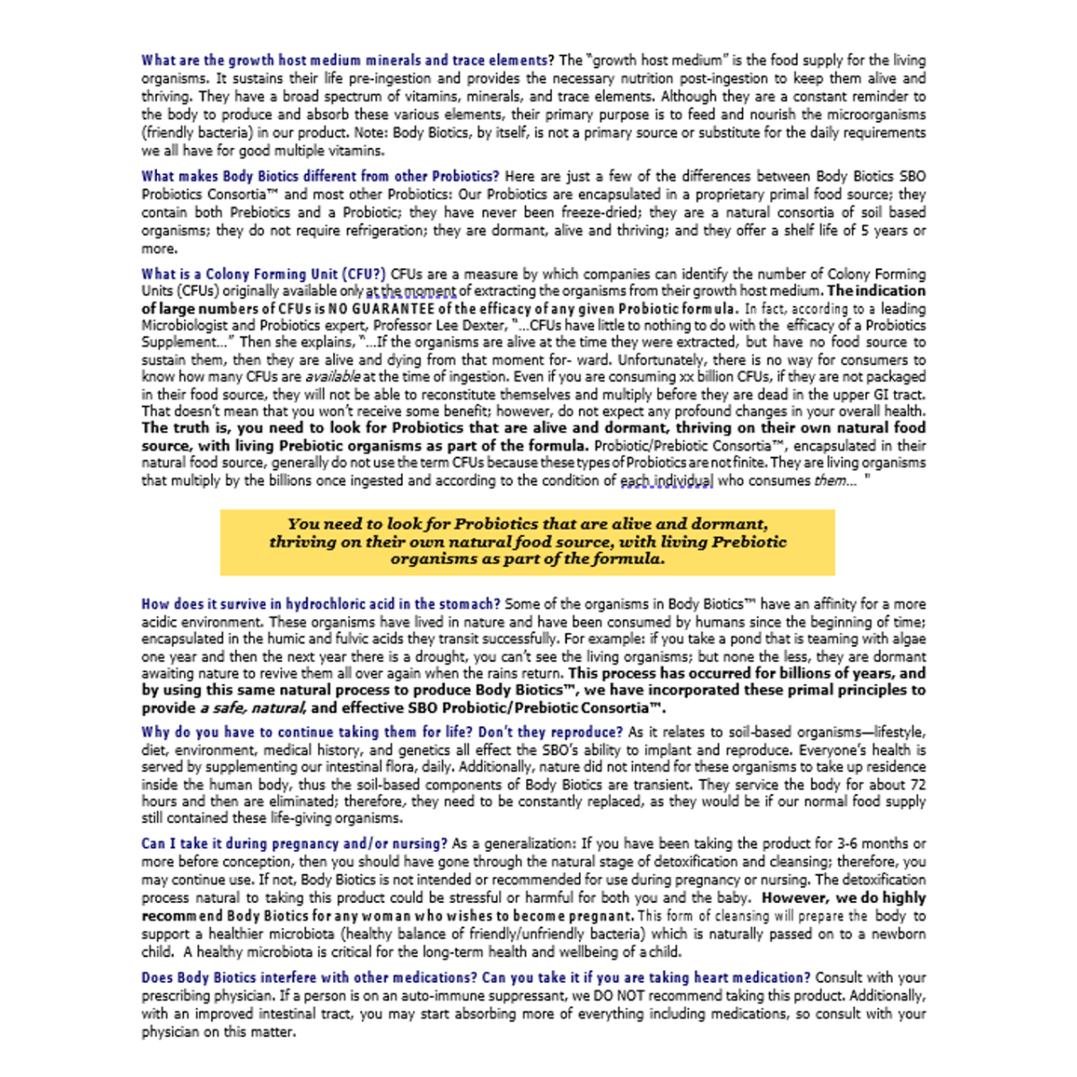 To be highly effective, PRObiotics require PREbiotic whole-food nutrients to help PRObiotic organisms survive and thrive in the human gut. Without these critical Prebiotic nutrients, it is difficult for Probiotic organisms to reconstitute, multiply, or adhere to the intestinal wall before simply passing through the digestive tract. BODY BIOTICS™has addressed this need for Prebiotics in there formula by using a proprietary ancient blend of Humic and Fulvic acids to culture a symbiotic blend of 8 highly effective friendly bacteria super-stains. Once cultured and dehydrated (never freeze-dried, which cases freeze-fracturing of the organisms and lessens their ability to perform,) these alive and dormant super-strains go directly to encapsulation and are never separated from their natural food source. By maintaining the integrity of this natural process, BODY BIOTICS™ provides a hardy, alive and thriving healthy balance of friendly bacteria trained to symbiotically work as they did in nature to populate the human gut and provide a "crowding out" (known as competitive exclusion) of undesirable disease-causing organisms, such as yeast, fungus, parasites, mold and many others; to promote better gut integrity and improved function, increased immune function, and improved absorption.