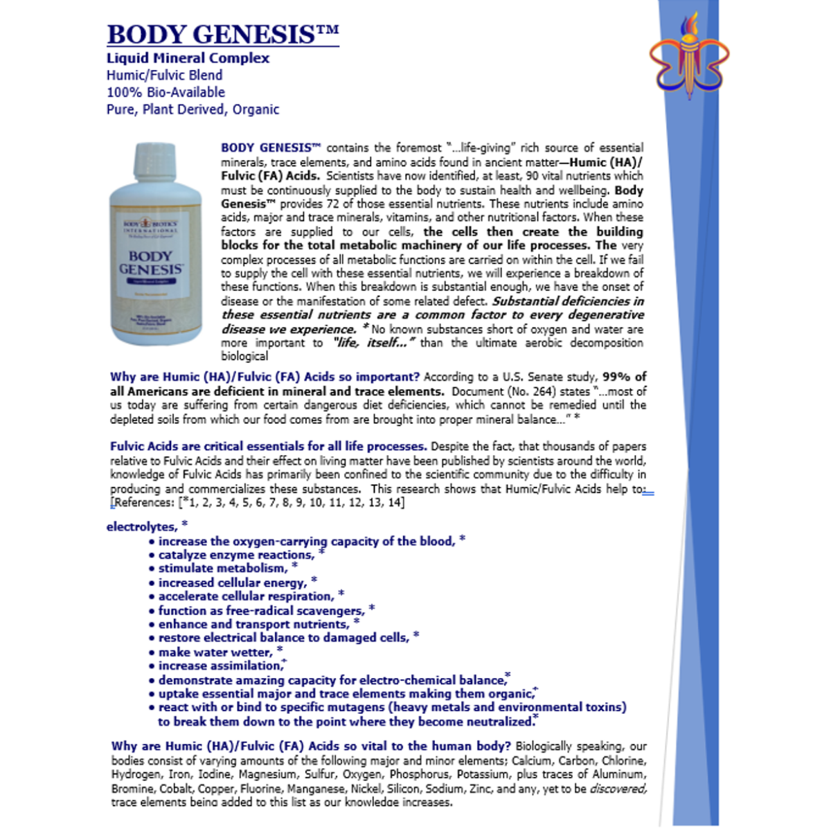 Body Genesis™ contains the foremost life-giving, rich source of essential minerals, trace elements and amino acids found in ancient matter, Humic (HA)/Fulvic Acids (FA). No known substances short of oxygen and water are more important to life itself than the ultimate aerobic decomposition biologic compound of all living matter. Scientists have identified at least 90 vital nutrients which must be continuously supplied to the body to sustain health and wellbeing. These nutrients include amino acids, major and trace minerals, vitamins, and other nutritional factors. When these factors are supplied to our cells, the cells then create the building blocks for the total metabolic machinery of our life processes. The very complex processes of all metabolic functions are carried on within the cell. If we fail to supply the cell with these essential nutrients we will experience a break-down of these functions. When this breakdown is substantial enough, we have the onset of disease or the manifestation of some related defect.  Substantial deficiency in these essential nutrients is a common factor to every degenerative disease that we experience in life.
