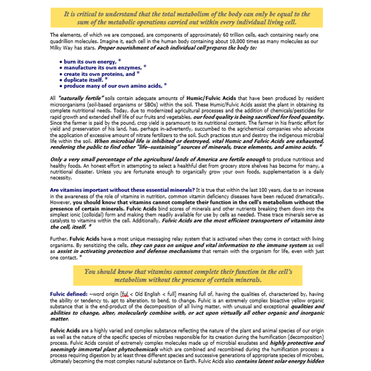 Why are Humic (HA)/Fulvic (FA) Acids so vital to the human body? Biologically speaking, our bodies consist of varying amounts of the following major and minor elements; Calcium, Carbon, Chlorine, Hydrogen, Iron, Iodine, Magnesium, Sulfur, Oxygen, Phosphorus, Potassium, plus traces of Aluminum, Bromine, Cobalt, Copper, Fluorine, Manganese, Nickel, Silicon, Sodium, Zinc, and any additional, yet undiscovered, trace elements being added to this list as our knowledge increases. The elements we are composed of are components of approximately 60 trillion cells, each containing nearly one quadrillion molecules. Imagine it, each cell in the human body containing about 10,000 times as many molecules as our Milky Way has stars. Proper nourishment of each individual cell prepares the body for a number of enhanced functions, such as, to produce many of its own amino acids, burn its own energy, manufacture its own enzymes, and create its own proteins.