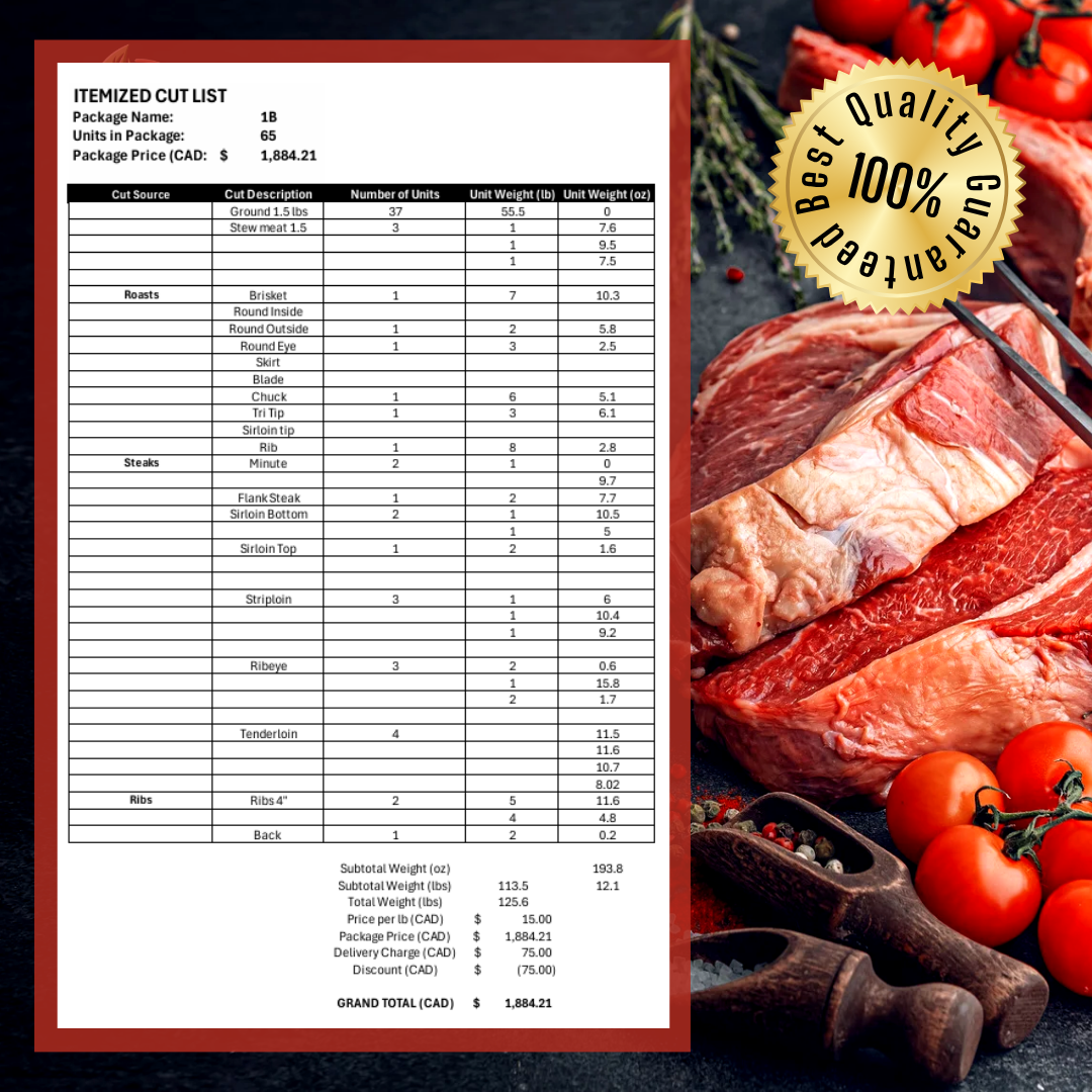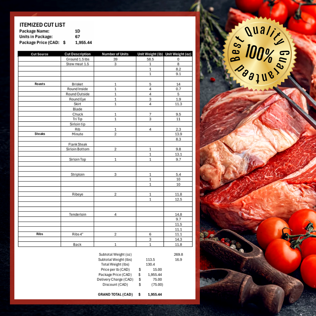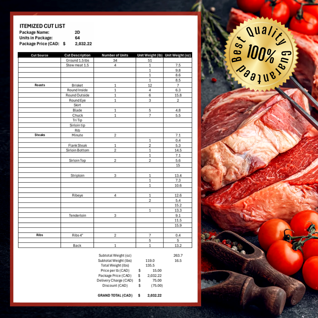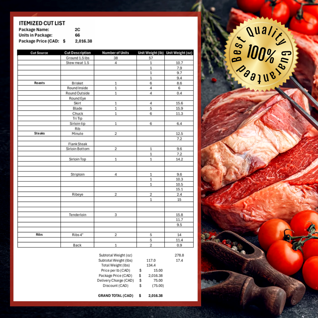 Don’t miss out on premium Alberta beef delivered directly to your door. Secure your quarter cow order now with a $500.00 deposit, and bring a farm-to-table experience that supports both quality and sustainability to your kitchen.