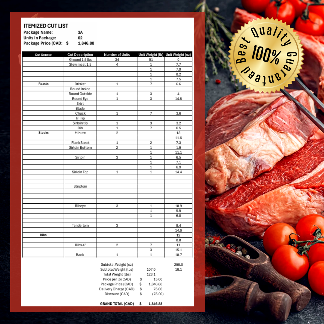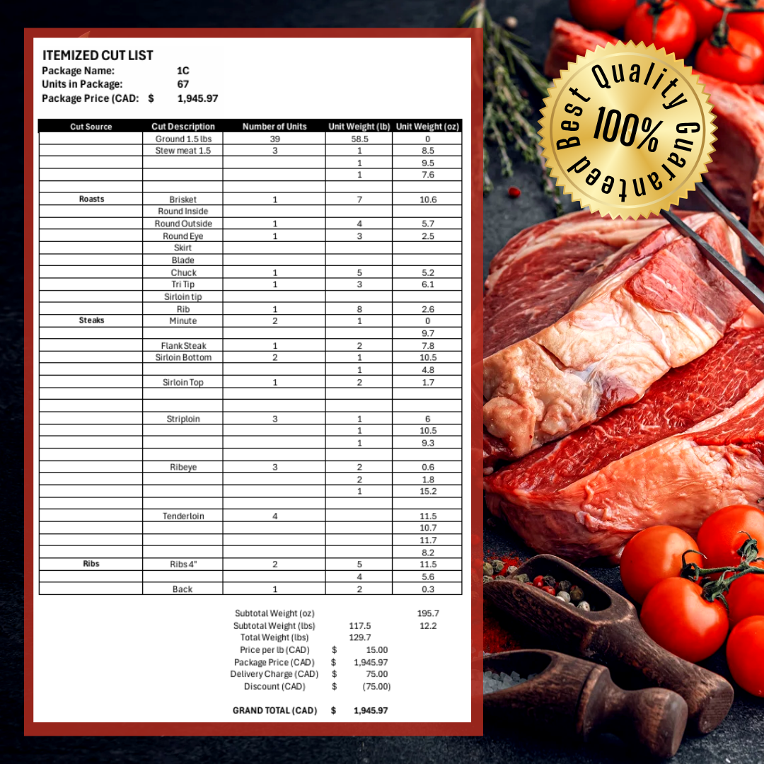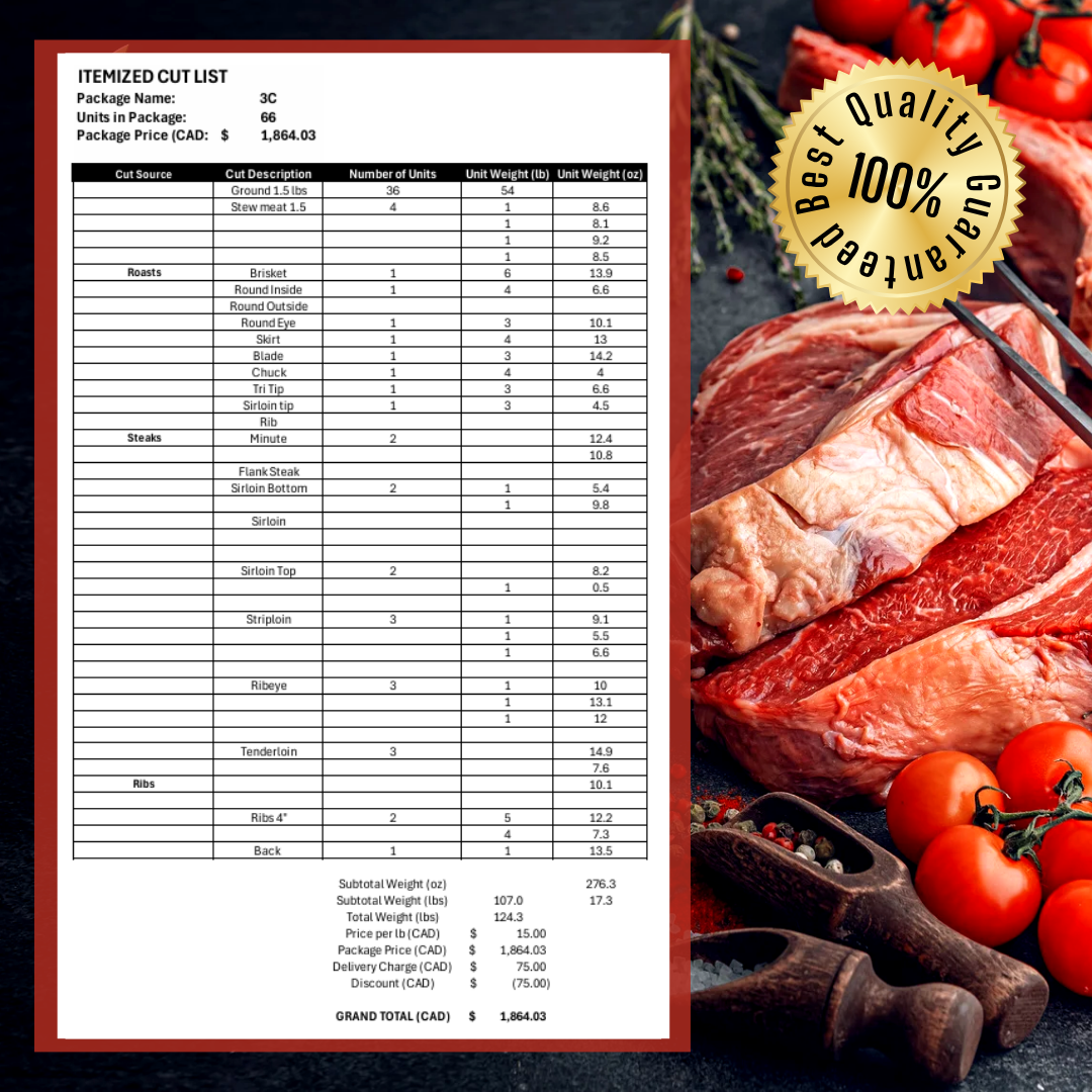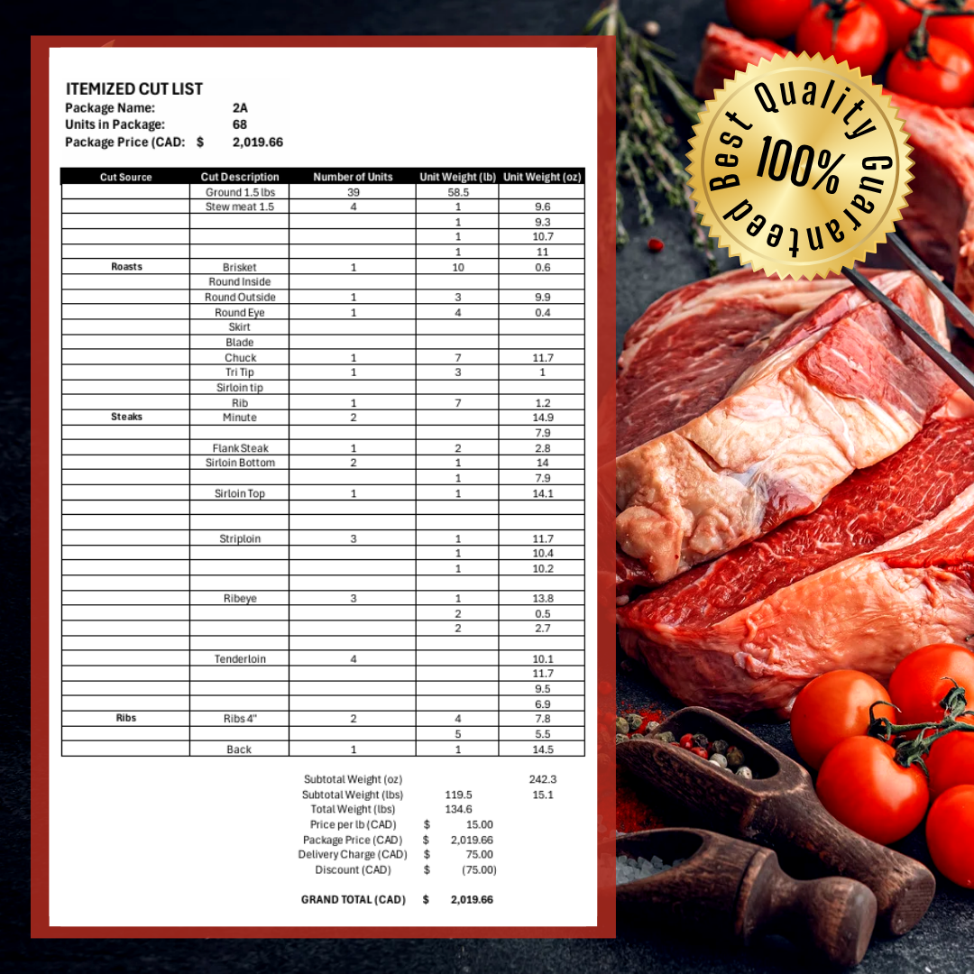 Once your order is placed, we select a prime Alberta-raised cow for processing. Our process is transparent and respectful, ensuring you receive quality meat from a trusted source. The final price is determined by the total weight, and the deposit will be deducted from the final amount due.