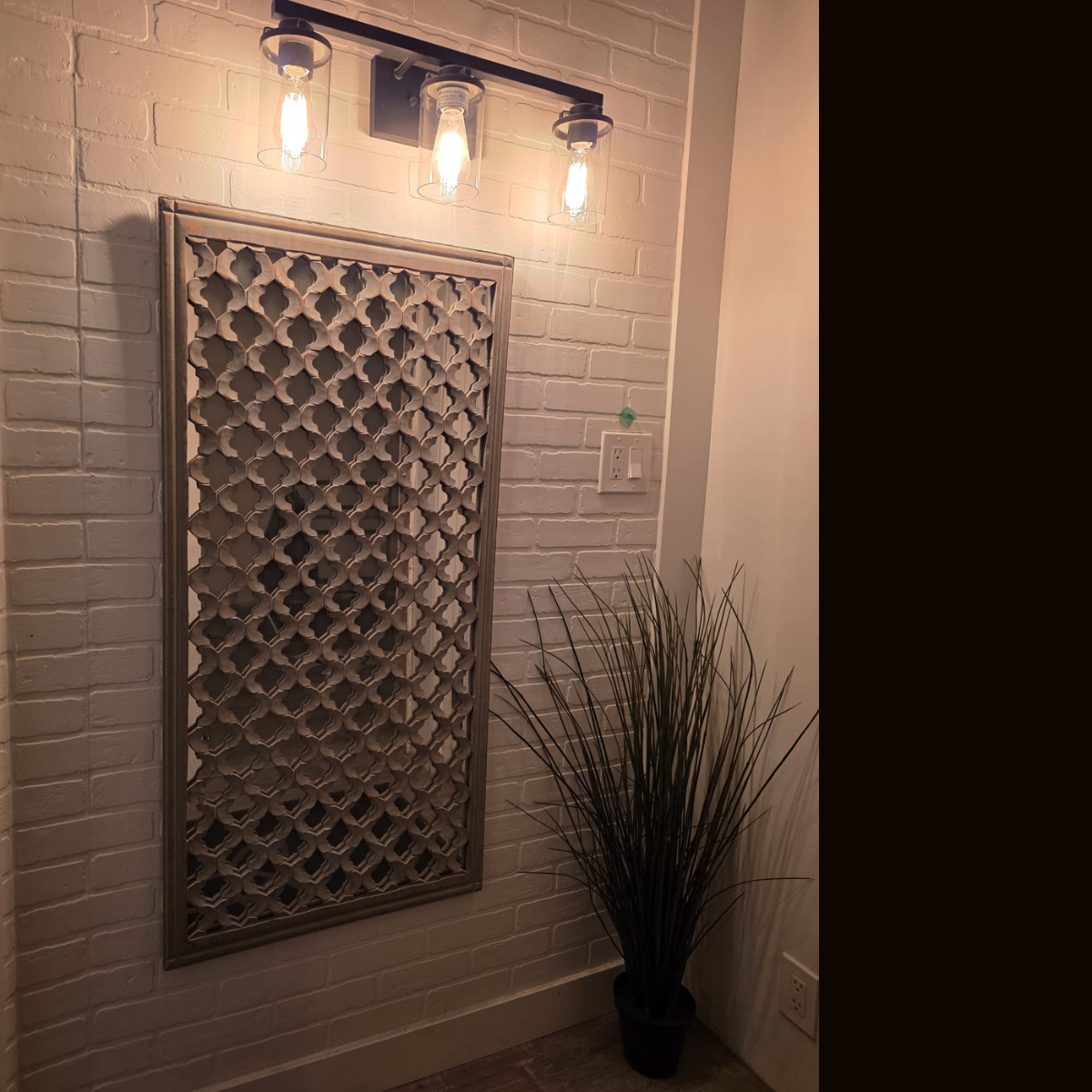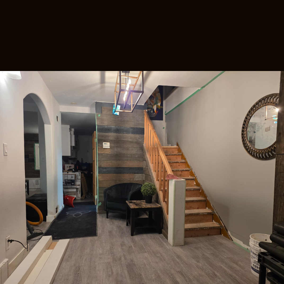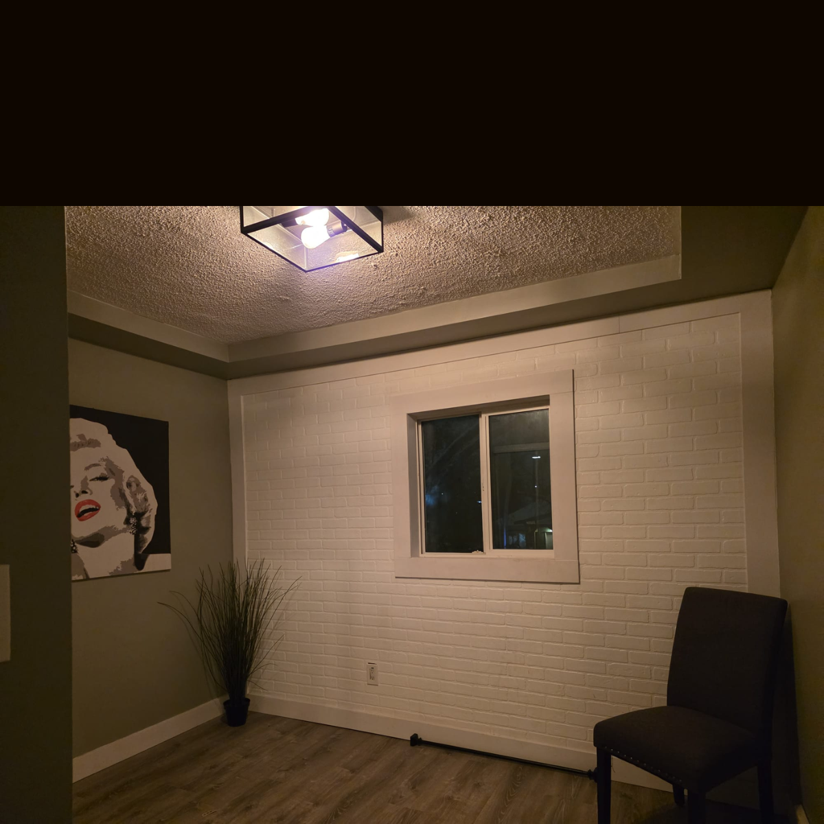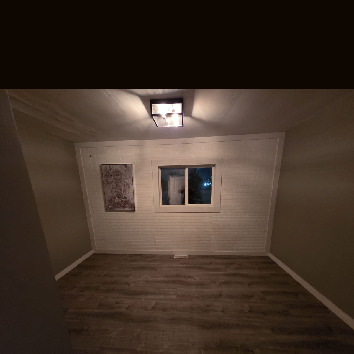 Upstairs, the home offers three well-proportioned bedrooms, including two generous primary-sized rooms and one smaller bedroom ideal for a child’s room, nursery, or home office. Brick feature walls add warmth and texture, while mirror closet doors with built-in organizers maximize storage and light. New vinyl flooring, matte black lighting fixtures, new doors with privacy locks, and oversized baseboards throughout create a cohesive, modern finish.