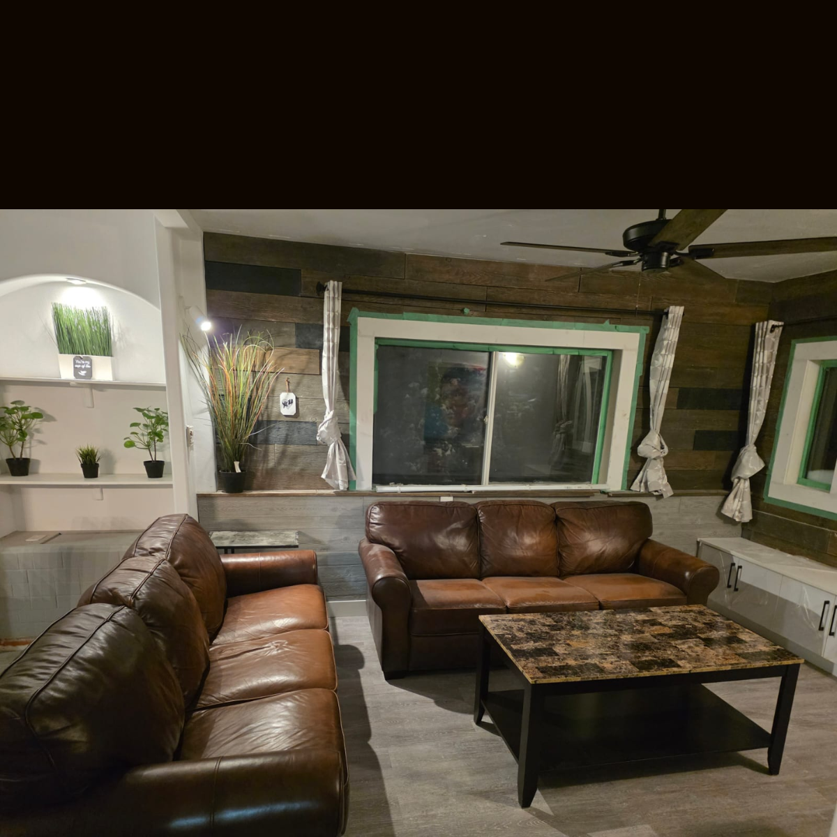 The family and TV room is a true gathering space, thoughtfully designed for comfort and connection. Featuring built-in cabinetry, panel and wood feature walls, and an entertainment wall, this room is perfect for relaxing or hosting. Natural light, an overhead fan, and a well-proportioned layout make it an inviting area that feels both stylish and livable.