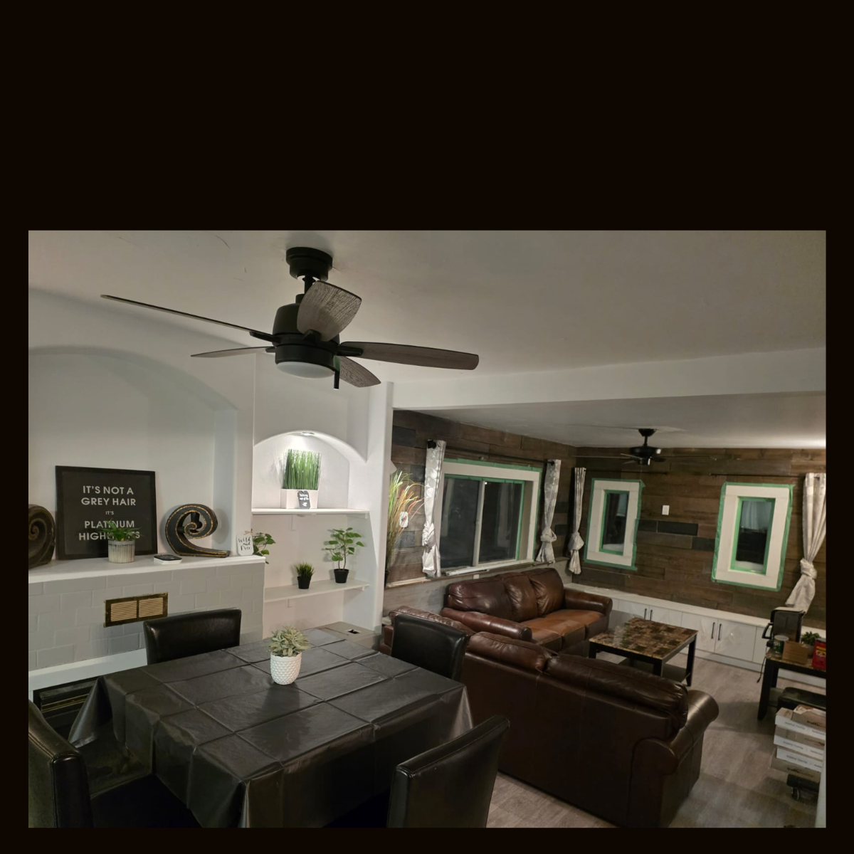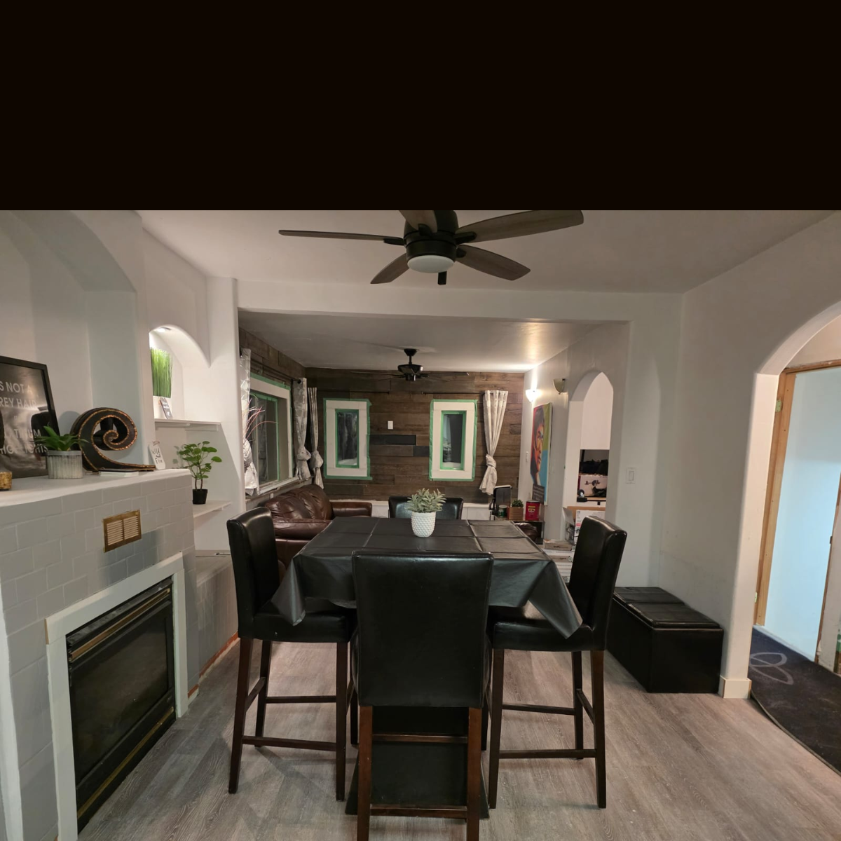 The dining and eating nook is a standout feature, centered around a fireplace that adds warmth and ambiance year-round. Designed to feel open yet cozy, it’s ideal for family meals, entertaining friends, or relaxed mornings with coffee. A feature wall with accent lighting and a remote-controlled fan with dimmable lighting elevate the space, making it both functional and atmospheric.